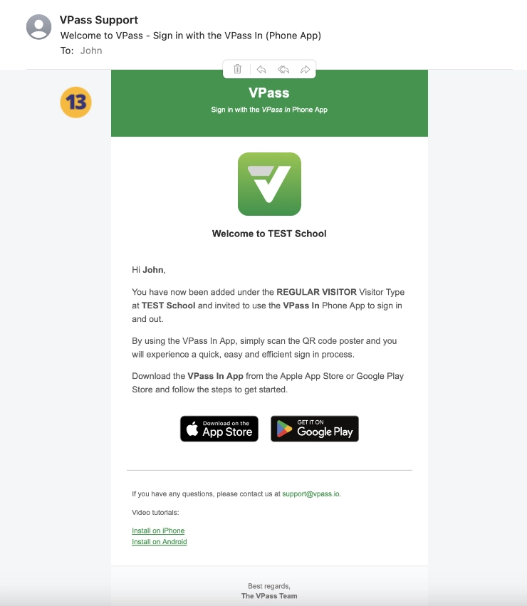 The welcome email (13) instructs the Registered Visitor to download the VPass In App, create a profile …and do their first sign in.