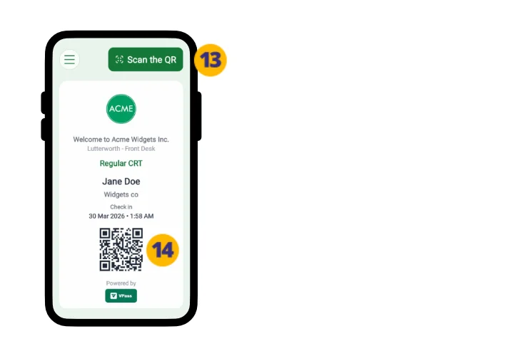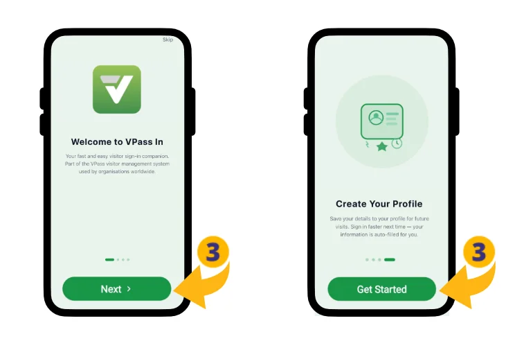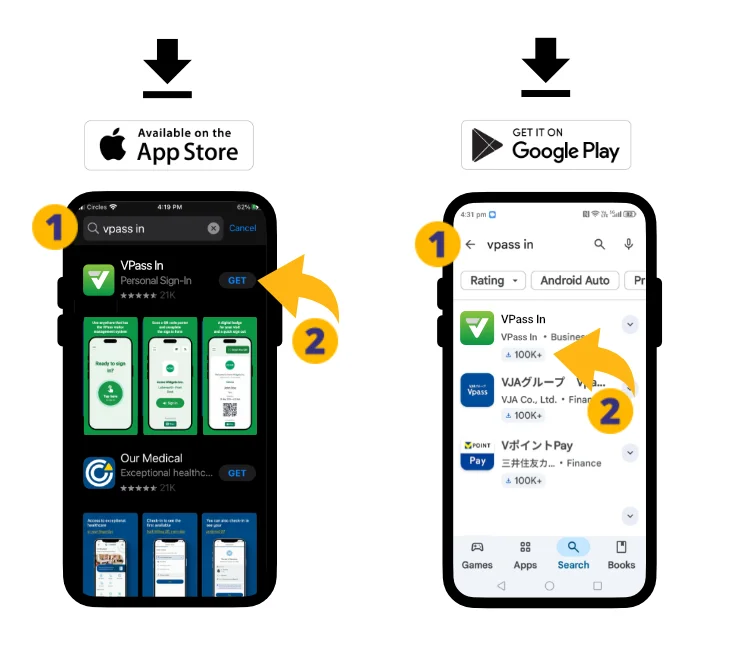 1. On your phone, go to the Apple App Store (iPhone) or Google Play store (Android) and do a search for “VPass In”. Download and open the App (2).