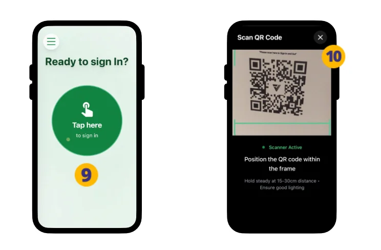 9. You are now logged in and ready for your first sign in – tap the green button.