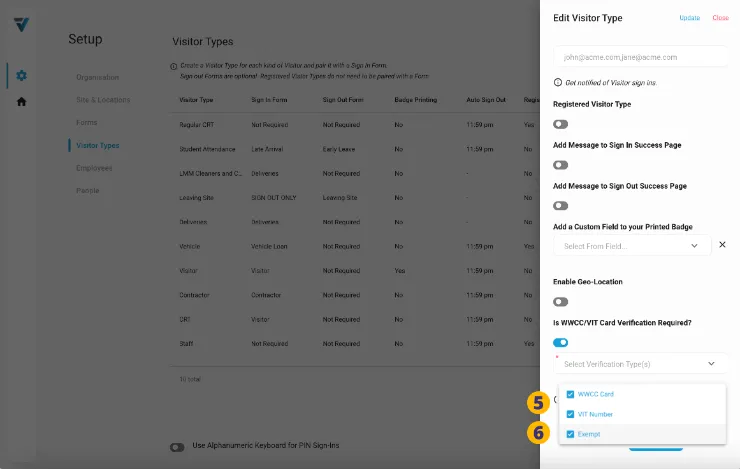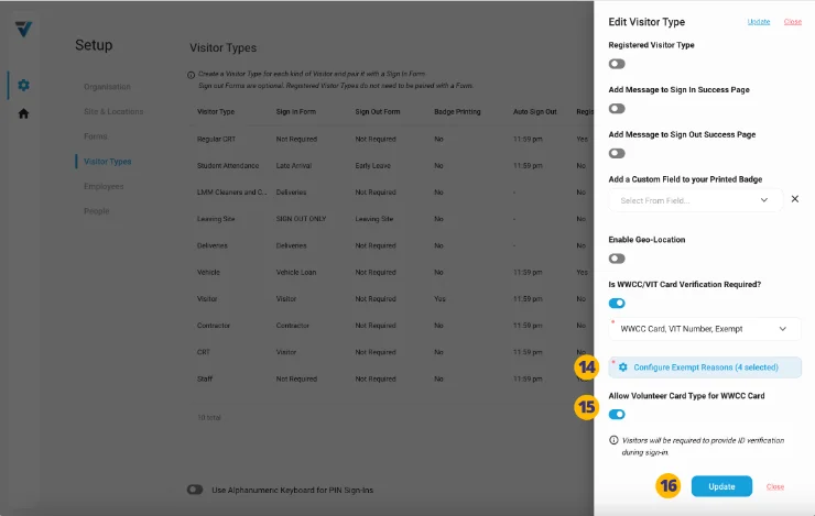 By default VPass will check both the “Employee” and “Volunteer” WWCC card types. However, if you wish to disallow holders of “Volunteer” cards, toggle this switch off (15).