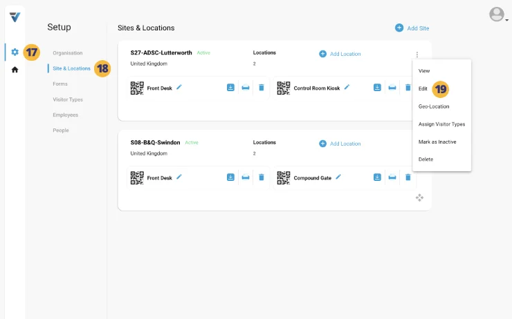 17. Go to the admin cog icon and select Sites & Locations (18).