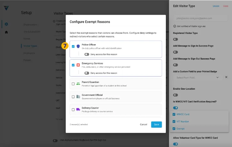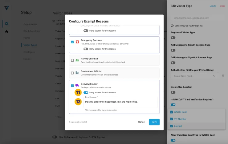 10. Another aspect of configuring each of your Exemption Reasons is to elect whether, when selected by a Visitor, a Deny Sign In takes place.