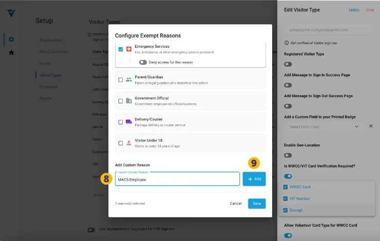 … or you may scroll to the bottom of the window to and define your own Custom Exemption Reasons (8). Once defined (eg: “MACS Employee”), click the Add button on the right hand side to Add it to the list (9).