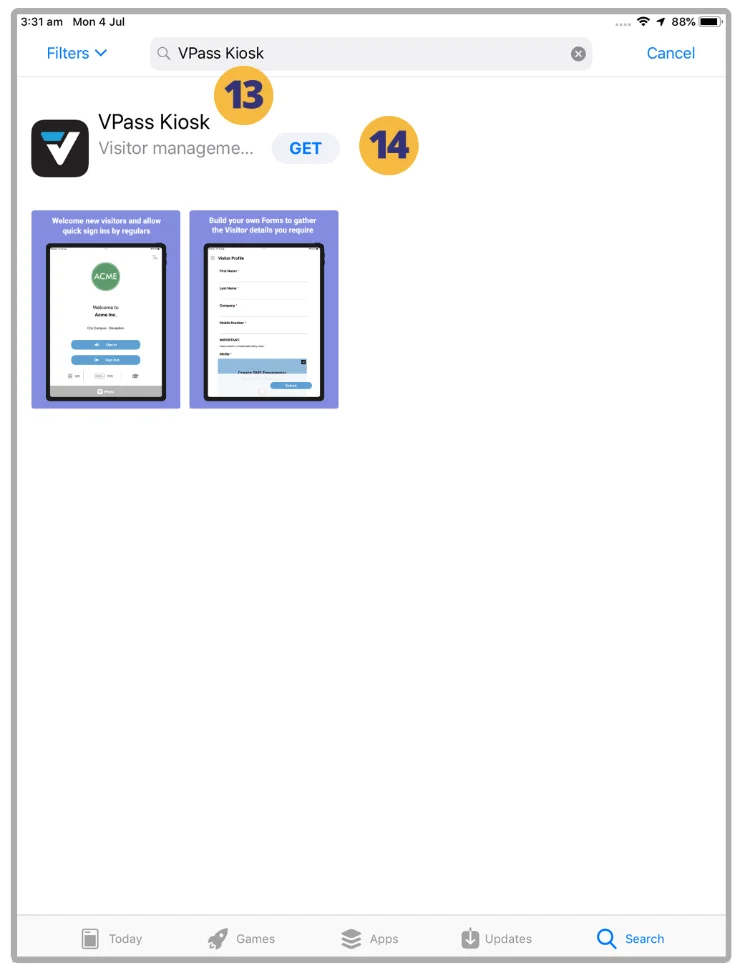 13. On the iPad’s App Store, do a search for “VPass Kiosk”.
