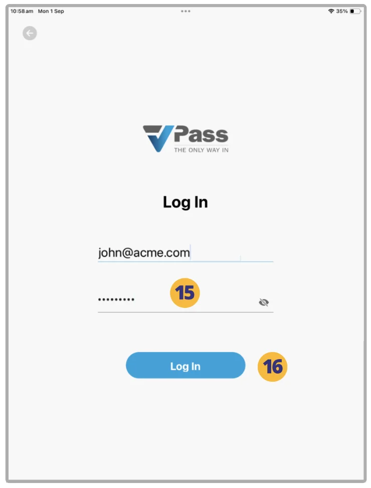 15. Enter your Account Owner, Super Admin or Admin password… and tap Login (16).