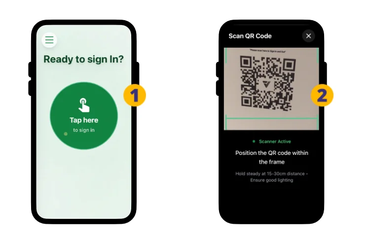 To sign out, tap the green Scan the QR button (6) …and scan the QR code poster (7).